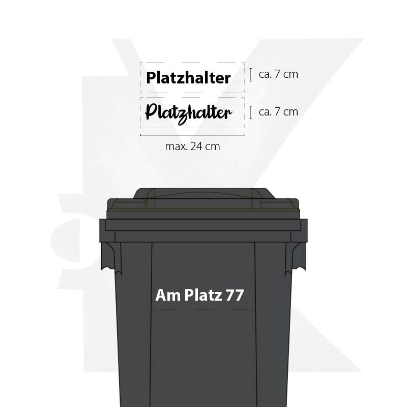 Verleihe deiner Mülltonne einen persönlichen Touch und verhindere Verwechslungen mit unseren geplotteten Aufklebern für Namen, Adresse oder sonstigem Wunschtext. Die selbstklebende Beschriftung haftet zuverlässig auf Ihrer Tonne und trotzt Wind, Wetter und UV-Strahlung.