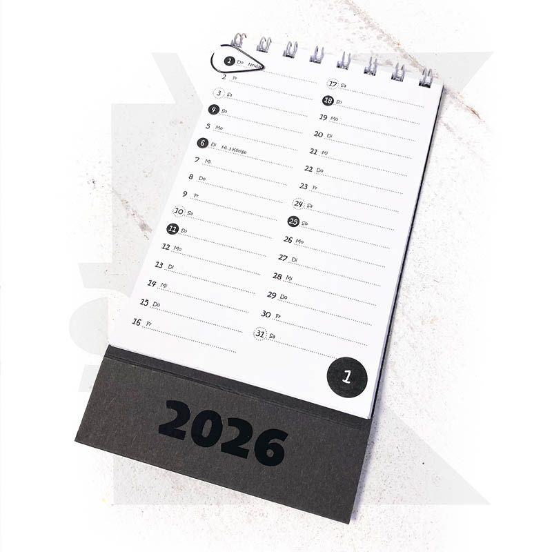 Dieser minimalistische Tischkalender 2026 zum Aufstellen kommt ohne SchnickSchnack aus.